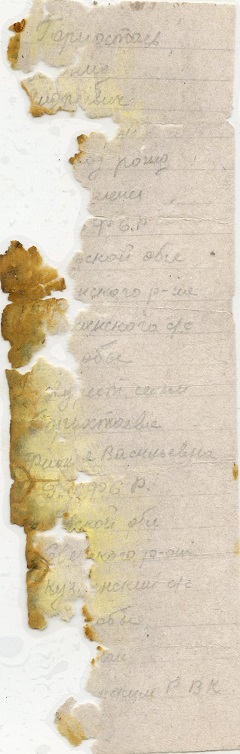 Останки солдата были обнаружены поисковиками отряда «Витязь» Московской общественной организации «Поиск» в декабре 2017 года на территории Ржевского района Тверской области, а 22 мая 2018-ого захоронены на Красноармейском мемориальном кладбище города Ржева. «Несмотря на плохую сохранность самодельной записки, извлеченной из гильзы от винтовки системы Мосина, экспертам лаборатории удалось очистить документ от окислов железа и прочитать записи, нанесенные карандашом, - рассказал эксперт Олег Гусев». Поисковики приступили к розыску родственников защитника Отечества.