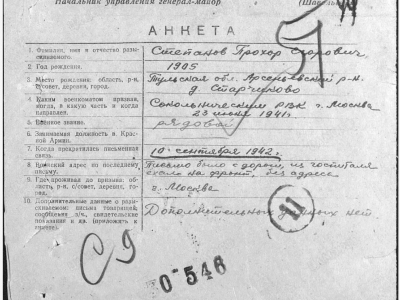 - Светлана, очень похоже на то, что он и есть. Там, где ФИО родственницы, отчество ее на «П». Левее, из-под обрыва, виднеется еще один хвостик-шапочка, который пишется сверху на «Т» или «П». Таким образом Степанова Т.П. очень даже может быть! Деревня Старчиково – однозначно! Я все думал, каким же РВК он был призван, то есть тоже видел сочетание букв "..ко.." в начале его названия. А это - Сокольнический.
