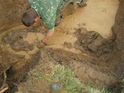 Наши ребята нашли бойца. он бежал по траншее и нес ящик с пулеметной лентой. У него был обнаружен документ, к сожалению, в очень плохом состоянии. Когда его "разложили", оказалось, что осталась только обложка. Воин остался безымянным. При подъеме все было сделано по всем правилам - образцово.