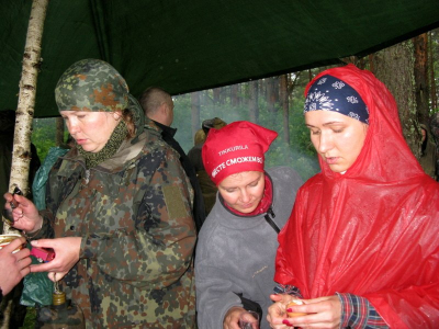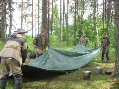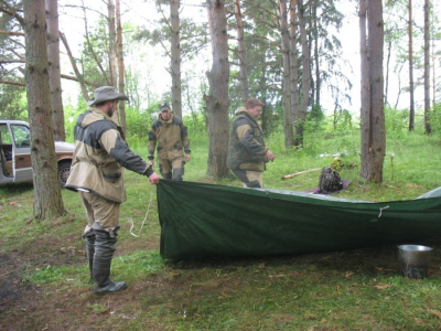 Выезд проходил совместно с поисковым отрядом "Подольск". Было запланировано как можно большим количеством людей провести разведку по новым наводкам, а заодно - прогуляться по старым местам. Трудились рядом с трассой под Зубцовым. Искали неучтенное захоронение. Там стояла деревня, за которую был бой. Из военного попадались только гильзы и немецие бутылки в погребе дома. Другая группа трудилась в N-ской деревушке за Ржевом. Тоже искали захоронение. Могильный крест после войны переносился, возможно, не один раз. То место, где он в итоге оказался, представляло собой искуственную насыпь. Ниточка терялась. Самая многочисленная группа работала по берегу Волги, но удача обошла и их. В середине дня пошел дождь, изрядно подпортивший участникам выезда насьтроение. Вымотавашись и промокнув, решили поставить лагерь на нашем любимом месте - высоком берегу великой реки.