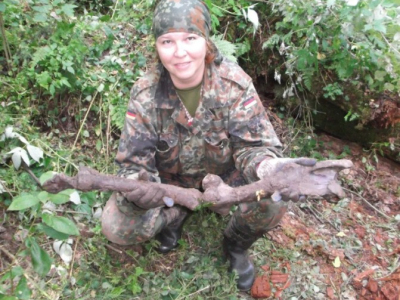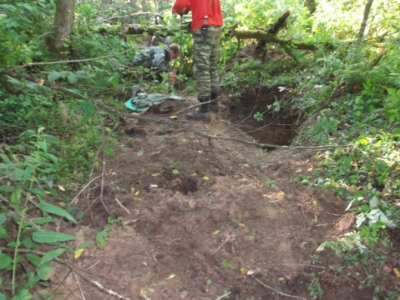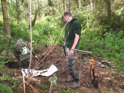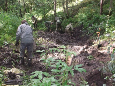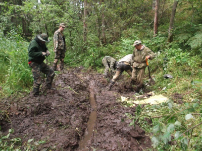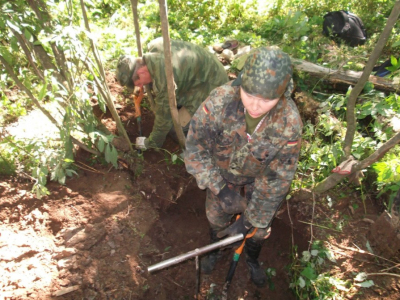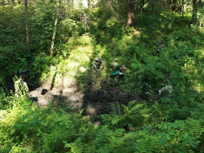 Потом в работе наступил "провал". В течении нескольких дней работа шла практически безрезультатно. Настроение у колектива стало падать. Сделала свое дело и традиционная июльская жара, большое количестов насекомых. Но, как часто бывает, то, что так долго и упорно искали, наматывая километры вдали от лагеря, оказалось практически под носом. Никита Зуйков, отстав от общей группы, решил проверить овраг рядом с лагерем, и нашел свои первых трех бойцов. Оставшиеся три дня Вахты работа кипела. Был перекопан как сам овраг с ручьем, из которого подняли много разрозненным останков, так и его склоны, где удалось взять неразмытых бойцов. Общий итог выезда - 24 бойца РККА (один, предположительно, командир) и два медальона. Была подписная ложка - "Конюхов", но по ней личность бойца установить не удалось.