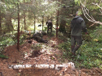 В этот раз наша сборная команда – «Высота» им. Дмитрия Сячина», «Витязь» и «Патриот» - стояла как всегда не вместе с основной Вахтой, а в районе урочища П------к. Стратегия была проста – дорабатывать овраг, в котором под конец прошлой Вахты подняли немало бойцов. В первый же день поиска на склоне оврага во вскрытой ячейке с настрелом Роман Хрульнов нашел солдата. В остальных ячейках, которые мы обследовали, был только сброс нехитрого солдатского имущества.