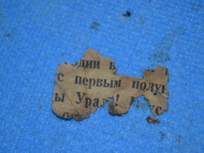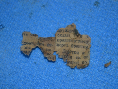 Вскоре Сергей Прохоров нашел яму на шесть человек. На вид - небольшое углубление, присыпанное опавшими листьями. В отличие от предыдущих бойцов, в яме была хорошая сохранность всех основных костей скелета. В кармане одного из бойцов уцелели остатки гозеты, в которую был завернут деревянный мундштук. Лежали солдаты "вальтом", головами на ботинках друг друга. Один был обут в сапоги - возможно, командир. Работая по 41 году, мы неоднократно обращали внимания на эту особенность - если в сапогах, то практически всегда - командир. Был случай, когда Илья Подколзин нашел повара в сапогах. Что же касается обрывков газеты - это была "ПРАВДА" №201 (8972), понедельник, за 1942 год.