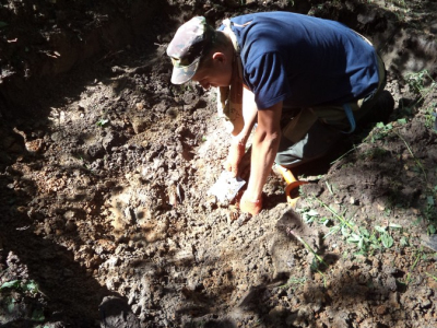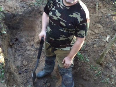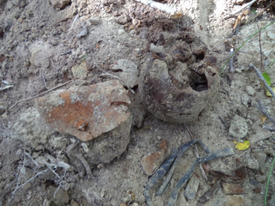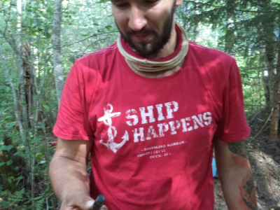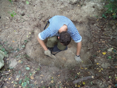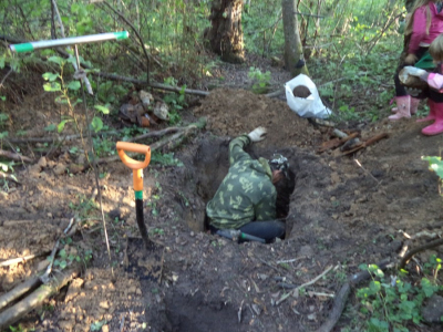 В начале Вахты поиск вели в районе старого лагеря, где стояли весной, пытаясь «выскочить» на пропущенный или недоработанный пятачок, но, несмотря на все усилия, в первые дни Вахты никак не удавалось поднять бойца. Только на четвертый или пятый день, выйдя на участок старой дороги, с обеих сторон облепленный ячейками и позициями, прямо в придорожной канаве удалось найти двух солдат, один из которых, предположительно, мог иметь отношение к войскам НКВД. Следующий день работы на этом месте не дал решительно никаких результатов, правда, было обнаружено и вскрыто несколько нетронутых ячеек, из которых достали противогазы, котелки, фляжки и кружки. Особенно запомнилась ячейка, с явно ощутимым глубоким провалом. Вскрыв ее до середины, мы поняли, что имеем дело с весьма глубоким укрытием – провал уходил на всю длину щупа. Правда, в итоге в ячейке нашлась лишь стеклянная фляжка с резиновой пробкой и немецкий котелок без крышки, он лежал на самом дне – глубина почти два метра – в листьях и ветках, сохранность была практически идеальной.