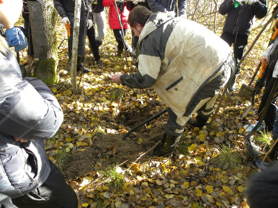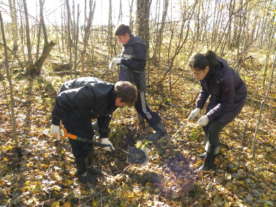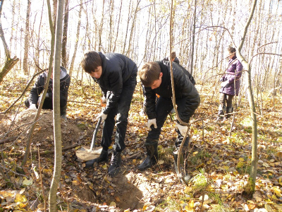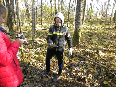 Наши поиски начались с инструктажа по технике безопасности, после чего группа выдвинулась на поиск в лес через поле, где наш отряд работал с приборами для глубинного поиска нынешней весной. Тогда в поле удалось обнаружить одного бойца, убитого в ячейке. Причем поверх останков лежал немецкий ремень с подсумком и штык-ножом. Эту ячейку, находившуюся на поле рядом с лесом, мы использовали как отправную точку в нашей работе, поскольку дальше цепь ячеек уходила в жиденький лес. Там же была проведена вторая часть инструктажа – рассказ об особенностях и технике поиска в данной местности при помощи щупа. Юным поисковикам рассказали, как обнаружить малозаметную ячейку, как правильно прозондировать ее щупом. Переходя от одной ячейку к другой, наша большая команда постепенно делилась на небольшие группы, равномерно распределяясь по всему лесу. Так прошел первый час поисков, который завершился обнаружением останков. Это было еле заметное углубление на впадинке, косой дугой пронизывающей лес. Останки залегали неглубоко, практически сразу пошли крупные кости ног, сильно поврежденные осколками.