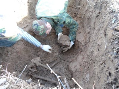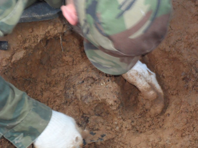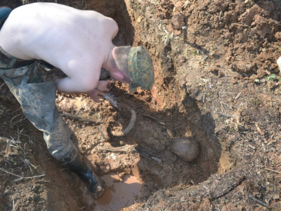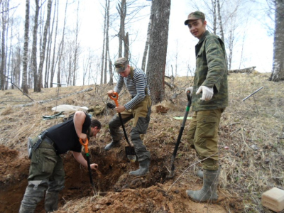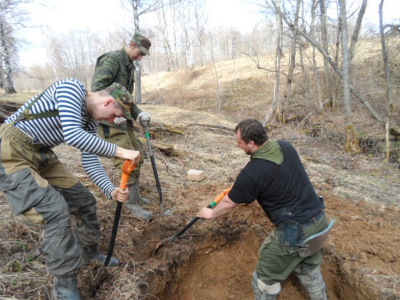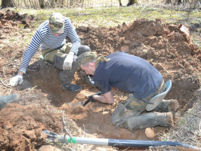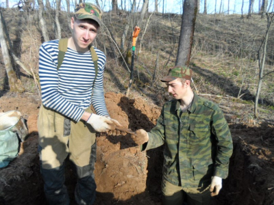 Вахта стояла до 7 мая, дорабатывая как уже известные урочища, так и разведывая новые пятачки. Четырех бойцов подняли в овраге практически у самого лагеря. В этом году командир поискового отряда "Высота" им. Дмитрия Сячина Илья Подколзин принял решение работать по новым протоколам эксгумации (Казанский образец), поэтому практически все подъемы проводились археологическим способом, за исключением "критических" случаев - залегание останков в ручьях и в корнях крупных деревьев. Сохранность костей была разная: у многих верховых бойцов - только основные кости, от черепа сохранялись лишь теменные кости, влипшие в шлемы. У солдат, найденных в сухих ячейках, практически полный скелет.