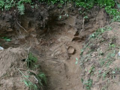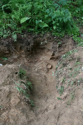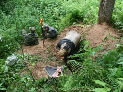 Во время следующего выезда работы на овраге продолжились. Сперва был найден боец в конце траншеи, спускавшейся в овраг, а потом мы наткнулись на останки двух верховых бойцов – одна из костей черепа виднелась сквозь опавшие листья. Все трое оказались бронебойщиками, имели при себе шомпол от противотанкового ружья, много стреляных гильз. Любопытным оказался тот факт, что гильзы были в «зимнем камуфляже», т.е. выкрашены в белый цвет. Материалов, позволяющих установить личности павших, обнаружено не было.