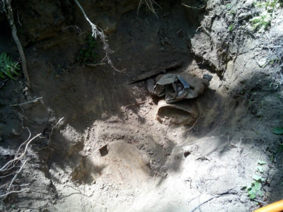 На следующий день обе команды продолжили отрабатывать овраг. Первая половина дня прошла без значимых результатов, но в итоге опытному поисковику Сергею удалось набить бойца в небольшом копанирчике над оврагом. При солдате - лопатка и противогаз. Останки посечены осколками. Когда работа по эксгумации близилась к финалу, под толстыми корнями старой березы был набит еще один боец. Извлечение его останков заняло достаточно много времени, требовалось аккуратно перерубить корни, не повредив и без того плохо сохранившиеся косточки.