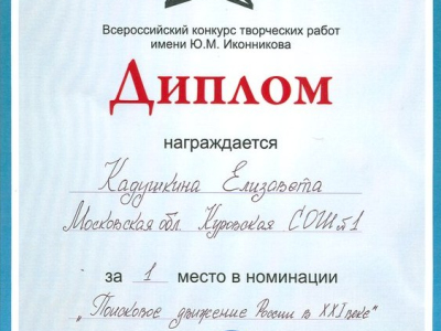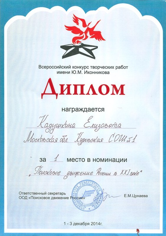 Поздравляем участников нашего коллектива, учащихся и учителей Куровской СОШ №1 с I местом во всероссийском конкурсе творческих работ имени Ю.И. Иконникова в номинации «Поисковое движение России». Творческий проект представляла Елизавета Кадушкина, принимающая активное участие в жизни отряда, участница учебно-тренировочной поисковой экспедиции «Вахта Памяти» весной 2014 г. в Духовщинском районе Смоленской области.Подробнее: http://rf-poisk.ru/news/505/