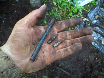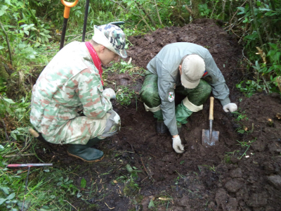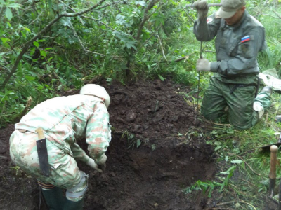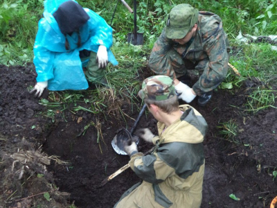 В первый день эксгумировали останки двоих бойцов, найденных во время последнего разведывательного выезда, и практически сразу пошли новые подъемы. Поиск вели преимущественно при помощи щупов – в основном мы имели дело с верховым залеганием останков, часть бойцов удалось поднять из неглубоких ячеек. Зона поиска ограничена – все погибшие были сражены пулеметным огнем противника на подступах к высоте и, по всей видимости, служили в одном подразделении. Существенно усложняли работу непролазные заросли крапивы, кустарника и ивняка, овитого хмелем: прежде чем продвинуться вперед, поисковикам приходилось прокладывать «коридоры» в бурной растительности, буквально прорубаясь через цепкую зеленую массу.