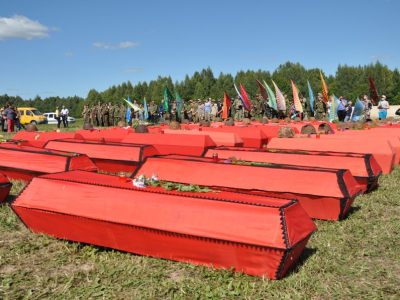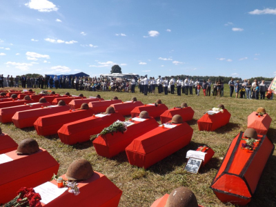 В числе прочих были захоронены и 87 воинов из 42-ой Гвардейской стрелковой дивизии, найденных нашим коллективом в 2014 году. Воронку с бойцами обнаружили в конце августа – привлекли внимание осколки бронекорпуса и элементы топливной системы советского штурмовика ИЛ-2, поэтому первоначально предполагалось, что это место крушения самолета. В начале сентября группа поисковиков предприняла повторный выезд с целью определения предполагаемого объема работ – на краю залитой водой воронки выкопали шурф, и на дне его показались не обломки авиационного металла, а носки валенок. Стало ясно, что в воронке лежат бойцы, но определить количество захороненных на начальном этапе представлялось затруднительным – яма была широка, глубока, походила на большую плоскую чашу, залитую водой, которую пришлось откачивать вручную. Итогом первых дней работы стала эксгумация останков 10 бойцов РККА, погибших зимой 1942 года во время операции «Марс». При солдатах не было обнаружено носителей информации и подписанных личных вещей, позволяющих установить личности погибших.