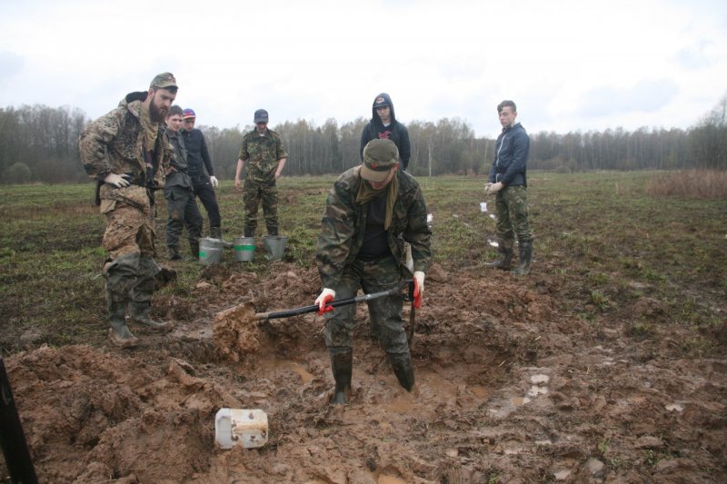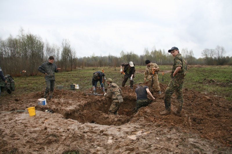 В наши дни поле, некогда сплошь испещренное воронками от разрывов крупнокалиберных боеприпасов, представляет собой ровную плоскость, под небольшим углом переходящую в овраг и без каких-либо видимых следов боевых действий. Работать на таком поле непросто: военное железо как в верхнем слое почвы, так и на значительной глубине, перемешано с деревенским, много кирпичей, остатков деревянных конструкций. Вносит свою лепту и время года – после нескольких капков лопаты ямка начинает заполняться водой. В таких условиях во многом приходиться действовать «на удачу»: останки павших бойцов могут находиться как на самом дне воронок, заваленные землей вперемешку с металлом, деревом, камнями, так и в центре земляного пласта на месте разрушенного взрывом укрытия. На окраине деревни во время осенних разведывательных выездов находили и вовсе верховых бойцов, чьи останки были едва прикрыты землей. Таким образом, обозначались зоны поиска для нескольких групп: работа с глубинными металлодетекторами на поле, предполагающая шурфовку всех найденных воронок, землянок и блиндажей, и верховой поиск на склоне оврага, когда необходимо «откликаться» на каждый сигнал прибора.