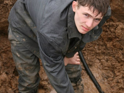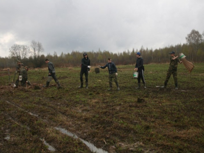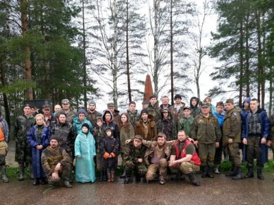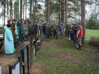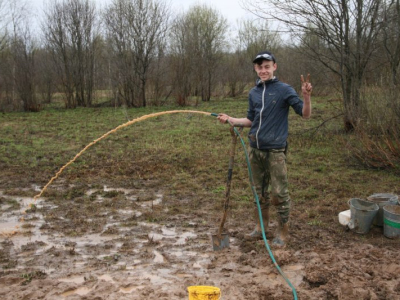 На третий день погода начала портиться. Несколько раз прошел дождь, размыв и без того хлипкую весеннюю дорогу, по колеям которой заструились ручьи. Все начатые накануне раскопы заполнились водой, и в дело пошла мотопомпа. Отчерпывать ямы продолжали и по старинке, ведрами. Сказать по правде, заранее предугадывая ситуацию с весенней водой, мы докупили перед экспедицией новые ведра, заготовили самодельные черпалки из старых канистр, но воды было столько, что их все равно не хватало на все раскопы. Другая трудность состояла в том, что определить, залегают ли в яме или землянке останки, можно было, только выкопав несколько широких шурфов до самого дна, что тоже замедляло темп работы. Во время раскопок приходилось разбирать, в том числе, и завалы из сельскохозяйственного металла и деревенского мусора, сброшенного в воронки. Тем ни менее, несмотря на все трудности, шли новые подъемы. В яме на поле были найдены трое солдат, при одном из которых был обнаружен медальон образца 1941-ого года. Капсулу вскрыли вечером в лагере – полотно бланка сохранилось полностью, без надрывов и утрат, но заполнен он был чернилами, от которых невооруженным глазом были различимы лишь точки-разводы по краям. Возможно, благодаря профессиональному экспертному исследованию удастся установить личные данные воина. Андрею Бондаренко из отряда «Единорог» удалось найти троих верховых бойцов в ложбинке оврага, между корней деревьев. К большому сожалению, при хорошей сохранности останков, никаких носителей информации, позволяющих установить личности погибших, обнаружить не удалось.