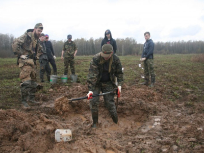 Работа нашего большого сводного коллектива из поисковиков Московского региона и Красноярского края в лице отряда «Феникс» строилась на чередовании старых, разрабатываемых не первый год, и новых зон поиска. С одной стороны, это помогало разнообразить монотонность ежедневного труда, с другой – позволяла использовать все возможности для тренировки молодого пополнения, чередовать «верховой» приборный поиск, работу со щупом с работой в сложных раскопах на мокром весеннем поле.