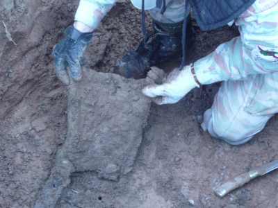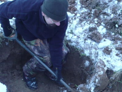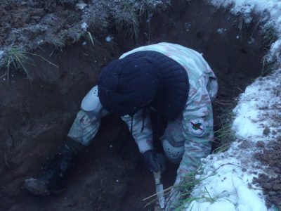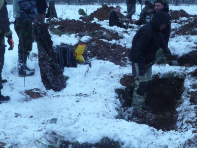 Во время выезда решили продолжить работу на объектах, выявленных в ходе осенней экспедиции. В первый день при раскопках участка зимней траншеи были найдены останки безымянного красноармейца, элементы амуниции и снаряжения противоборствующих сторон. По фронту траншеи было обнаружено несколько воронок от артиллерийских боеприпасов, в которые было стянуто военное железо и деревенский мусор. В одной их них среди искореженного страшными разрывами металла были обнаружены фрагментированные останки бойца. В следующие дни раскопки продолжились на другом объекте: был обследован значительный участок поля в полосе наступления частей РККА в ноябре 1942-ого года. В ходе работы были вскрыты участки фортификационных сооружений, ячейки, воронки, проведена рекогносцировка местности в рамках подготовки к весенней экспедиции.