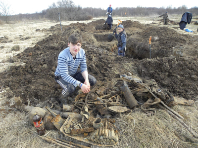 В ходе «Вахты Памяти» удалось частично реализовать планы, намеченные еще в конце прошлого сезона, по обследованию боевых траншей и открытых участков местности перед их фронтом. Во скрытых окопах было обнаружено большое количество сельского металлолома, перемешанного с «эхом войны» - касками, лопатками, снарядными и патронными ящиками, переносками… Большое количество металла затрудняло работу на объекте, тем ни менее, в траншее были найдены останки лежащих рядом двоих бойцов РККА. Большой интерес представляла и местность непосредственно перед траншеей: на ровном, на первый взгляд, поле были запаханы воронки и боевые ячейки, где ранее находили останки солдат. Их обследование представлялось важной и непростой задачей, так как практически во всех случаях была необходима шурфовка. В одной из воронок были обнаружены останки красноармейцев. Работы по их эксгумации растянулись на несколько дней. Благодаря кропотливому труду поисковиков в ходе раскопок не было упущено ни одной детали, бережно извлечены и законсервированы первичные носители информации: бланк солдатского медальона в деревянной капсуле и портмоне с чудом сохранившейся запиской.