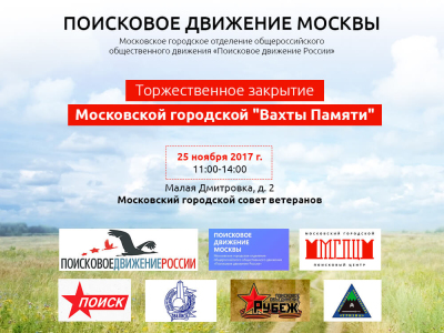 25 ноября в Москве в Совете ветеранов прошло торжественное закрытие «Вахты Памяти» на территории города Москвы. В мероприятии приняли участие ветераны войны и труда, ветераны поискового движения, командиры московских поисковых отрядов, представители Министерства обороны Российской Федерации, Российского военно-исторического общества, Комитета общественных связей города Москвы, Общественной палаты РФ, участники молодежных организаций.